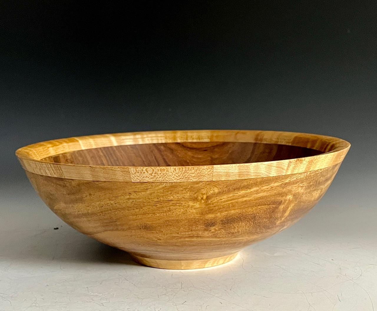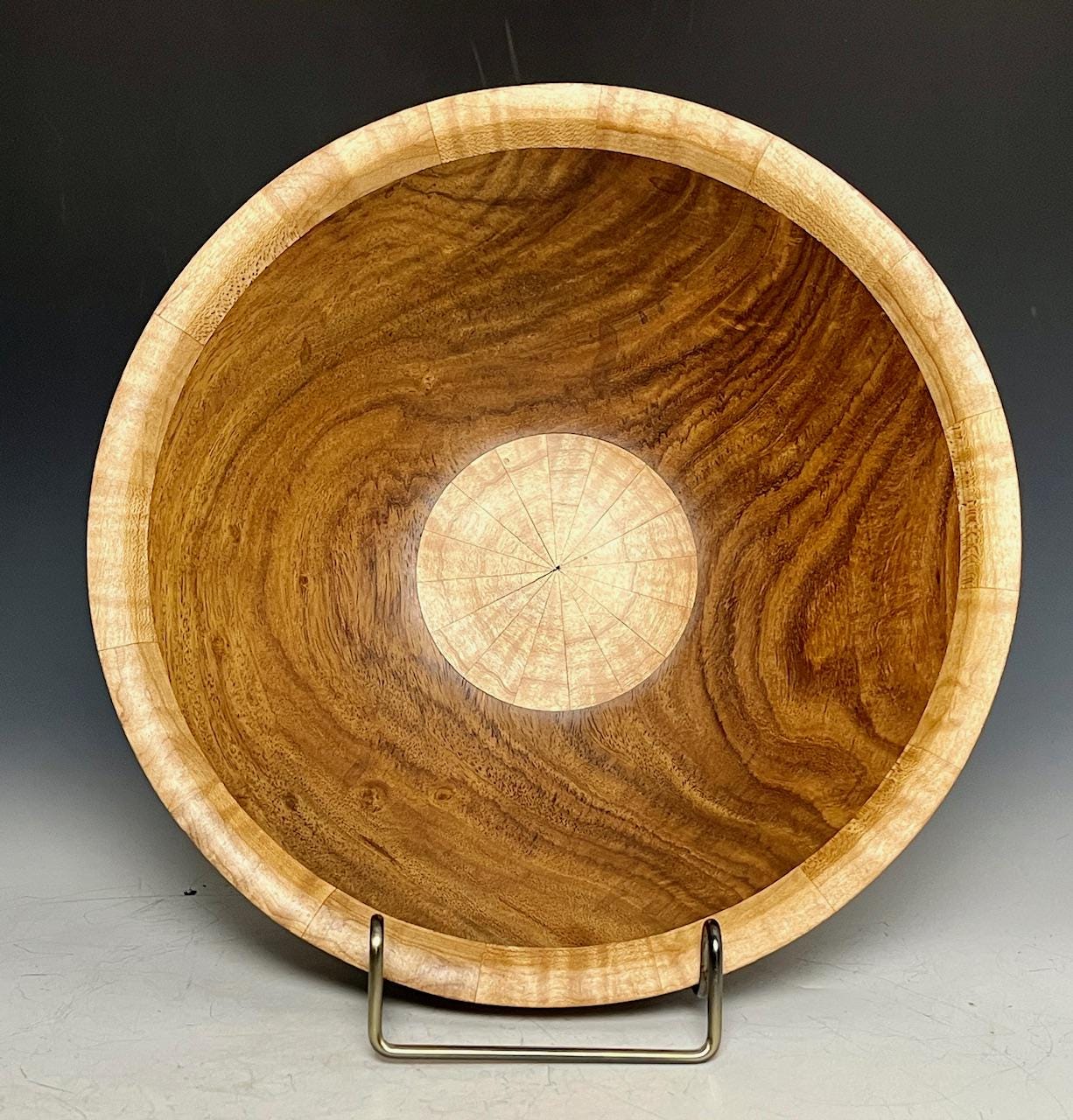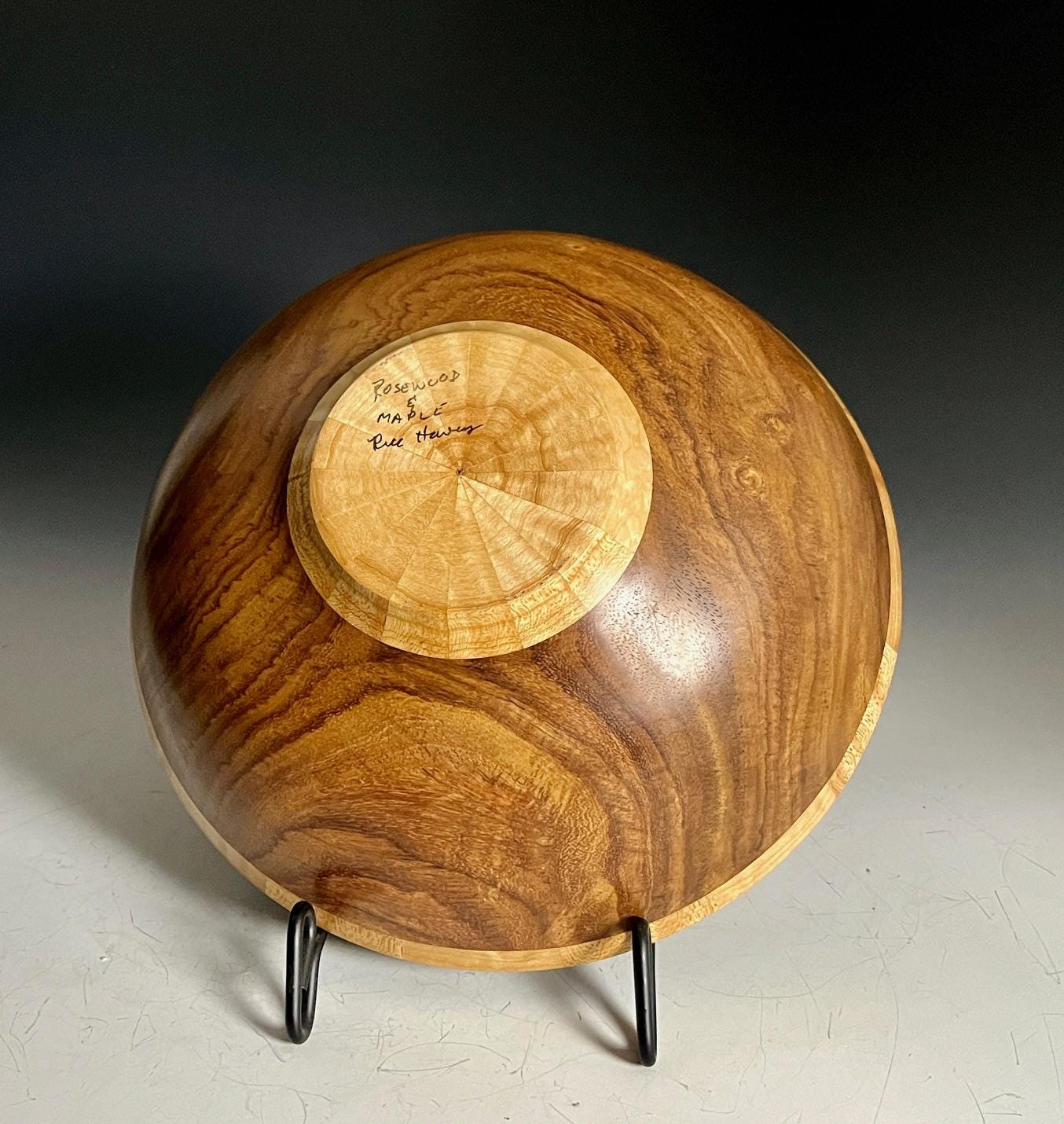 This bowl is turned from reclaimed Indian Rosewood wood. The rim and base are segmented maple. It is a unique and beautiful contrast of idfferent woods. The bowl easures approximately 9-3/4 inches in diameter and 3-1/4 inches tall.