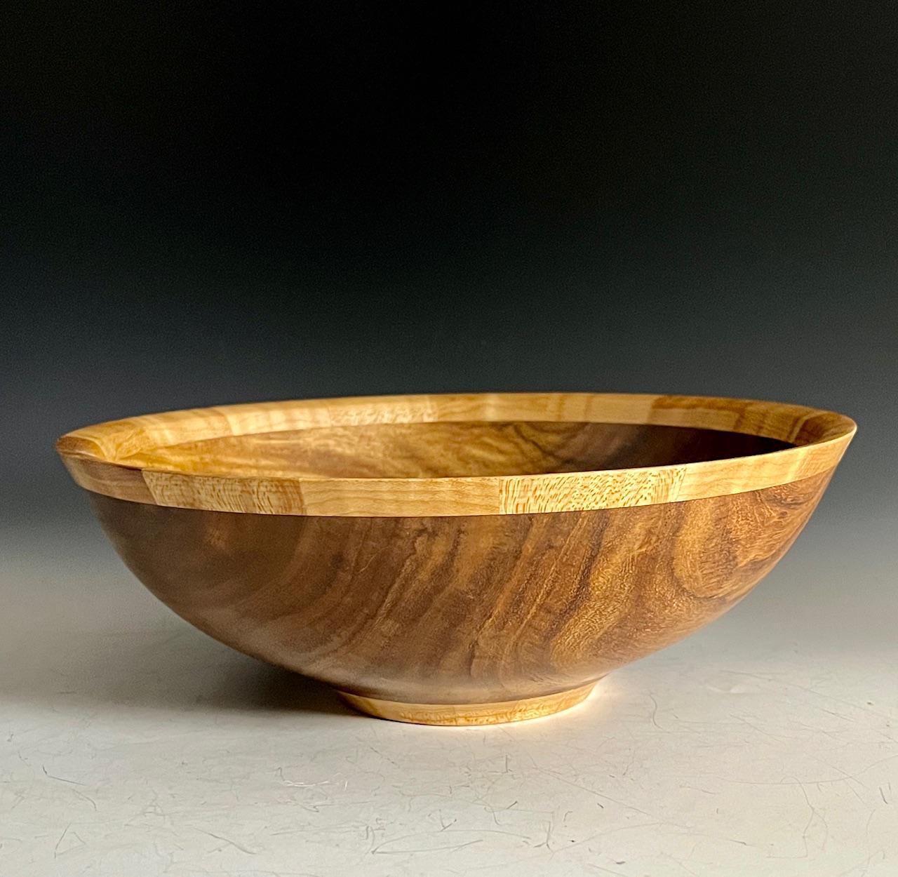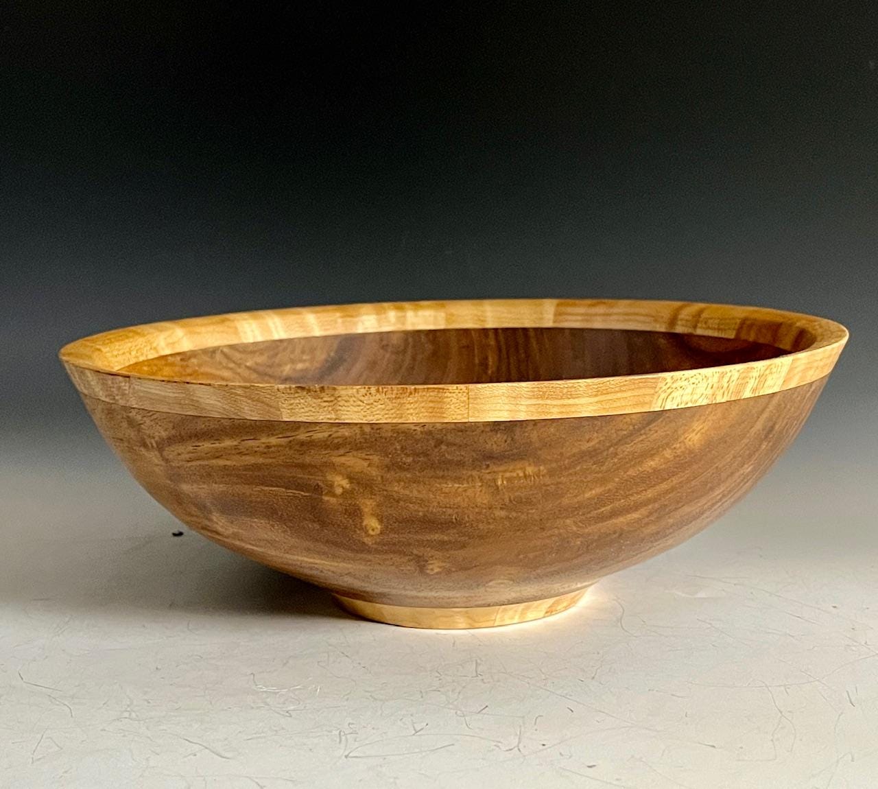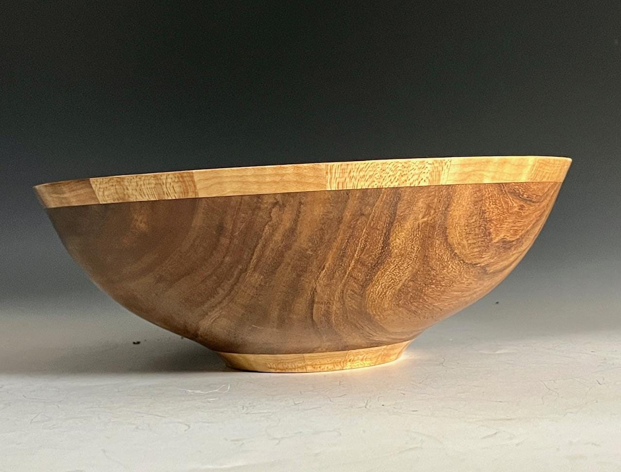 This bowl is turned from reclaimed Indian Rosewood wood. The rim and base are segmented maple. It is a unique and beautiful contrast of idfferent woods. The bowl easures approximately 9-3/4 inches in diameter and 3-1/4 inches tall.