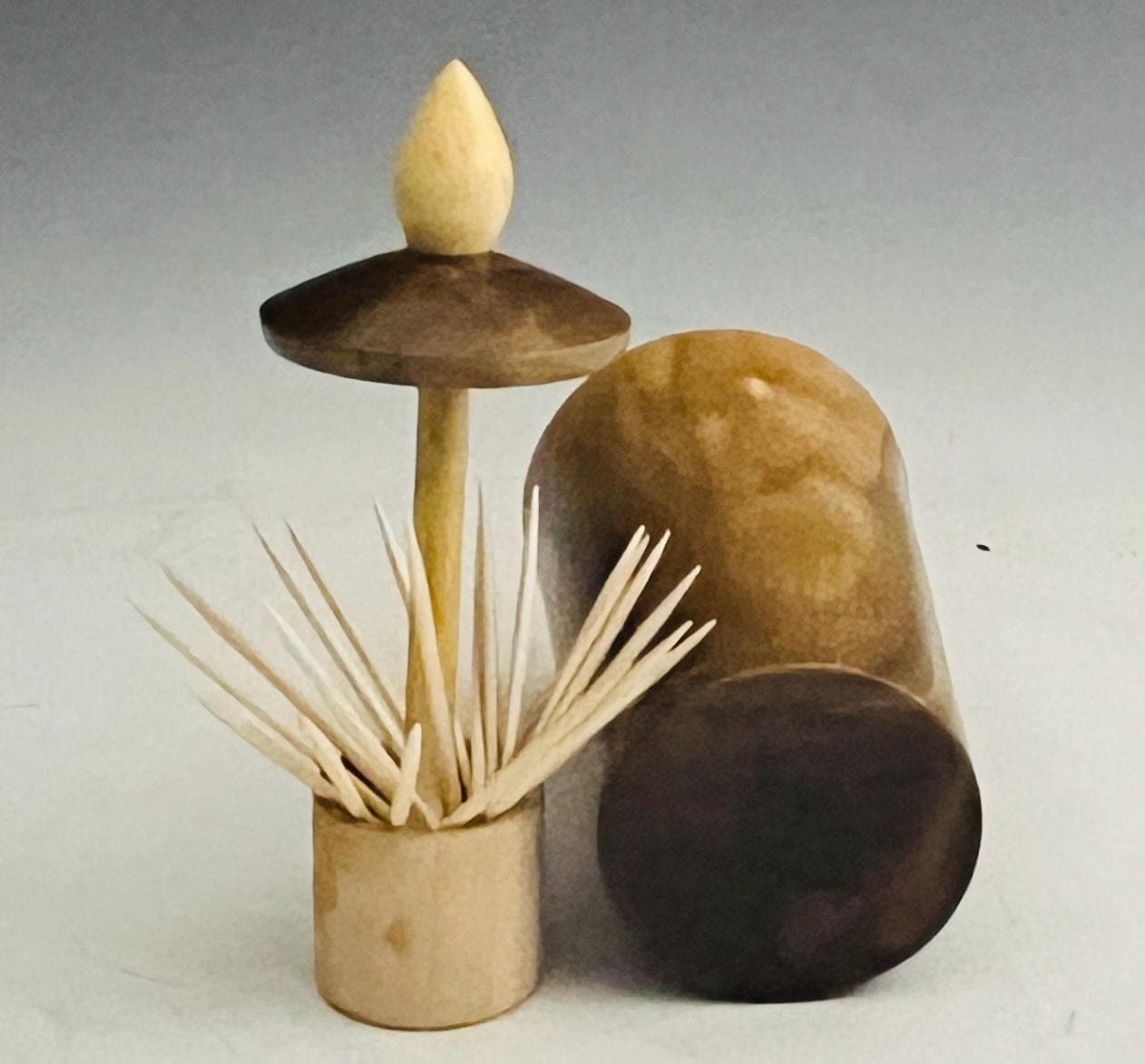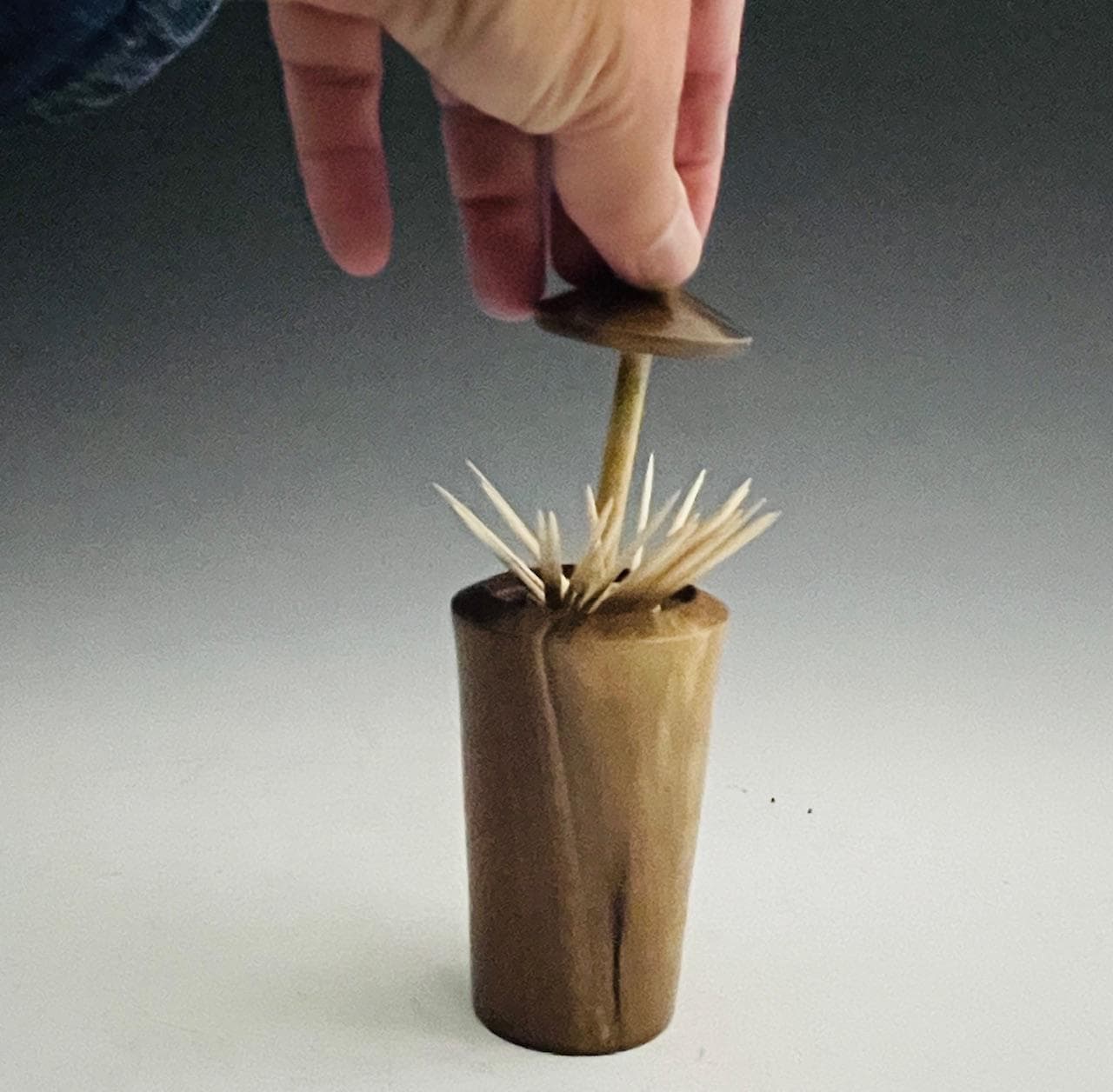 I am legally blind and hand turned this on my lathe. This toothpick holder/dispenser would be a fine addition to any home for use in the kitchen or in the dining room. It keeps the toothpicks handy and clean.