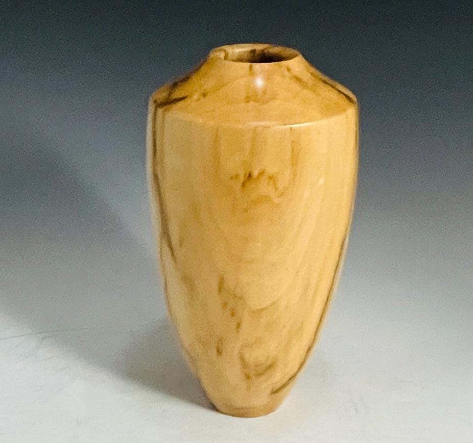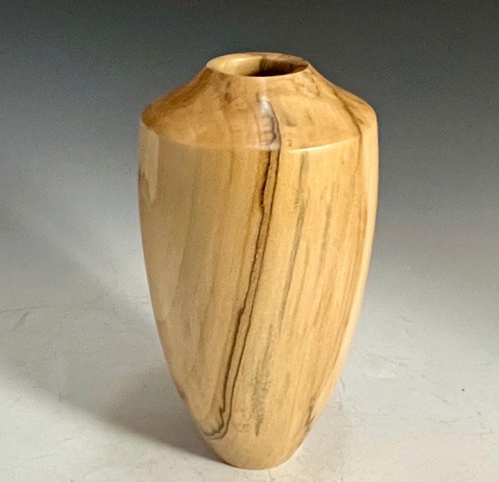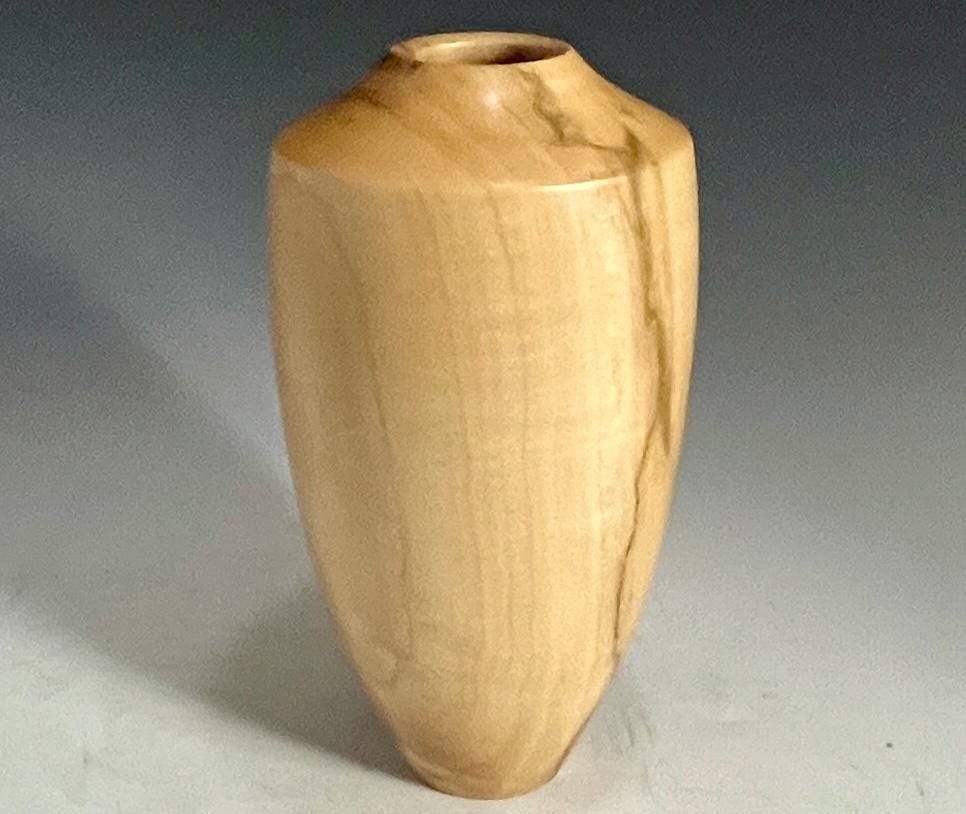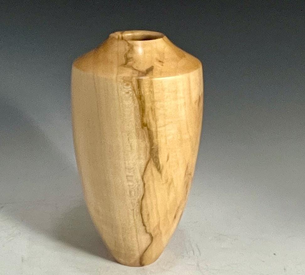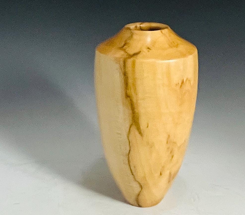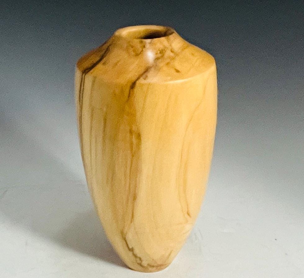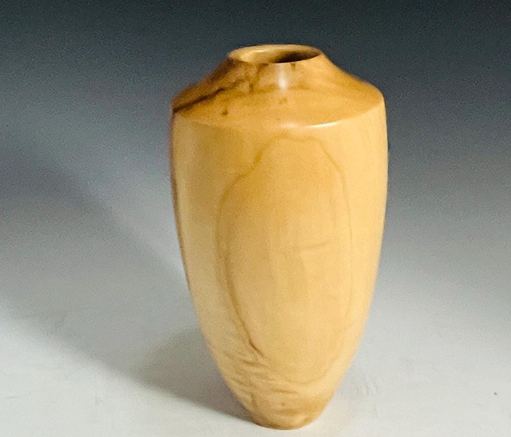 Custom handmade decorative vase for your home or office. This vase is made from a single piece of reclaimed Norway Maple wood. 7-1/2"h X 4"w. Finished with a few coats of oil and buffed. The piece of wood I used was cut in such a way that the light creamy color of the sapwood highlights the fantastic color and grain of the heartwood. It will look fantastic in any room of your house or at the office. Makes a great gift!!