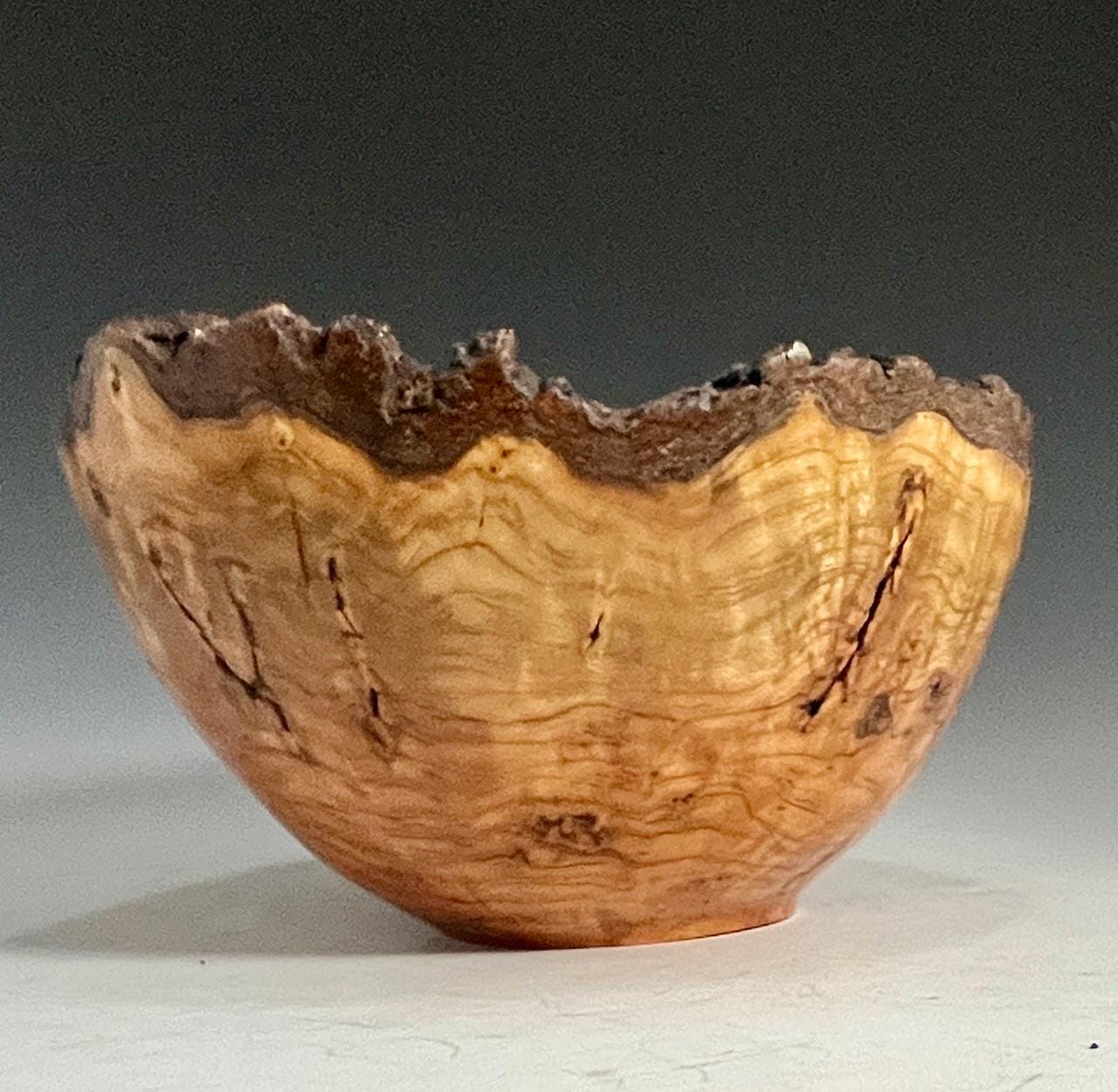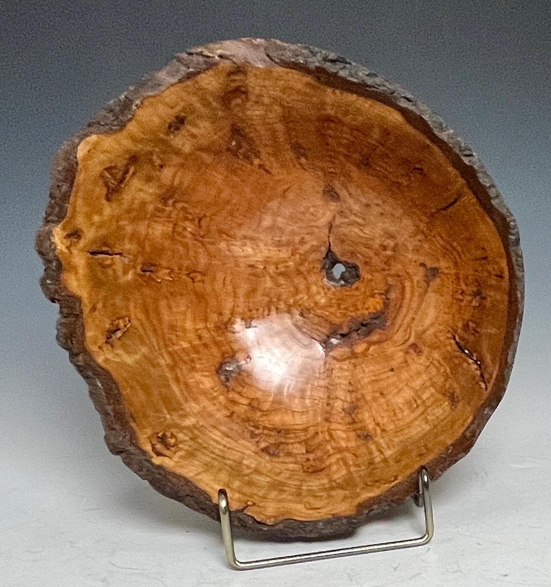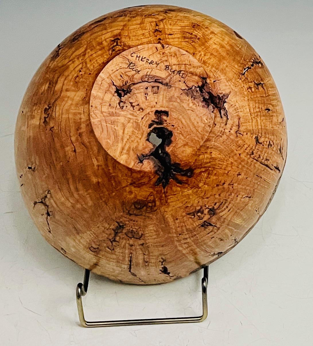 Custom handmade decorative art piece for your home or office. This bowl bowl made from a single piece of reclaimed cherry burl with natural bark edge. Lots of character with all the natural voids, cracks, and grain pattern. Measures about 7-1/2” X 4-1/2”h. Finished with several coats of hard wax oil and buffed.